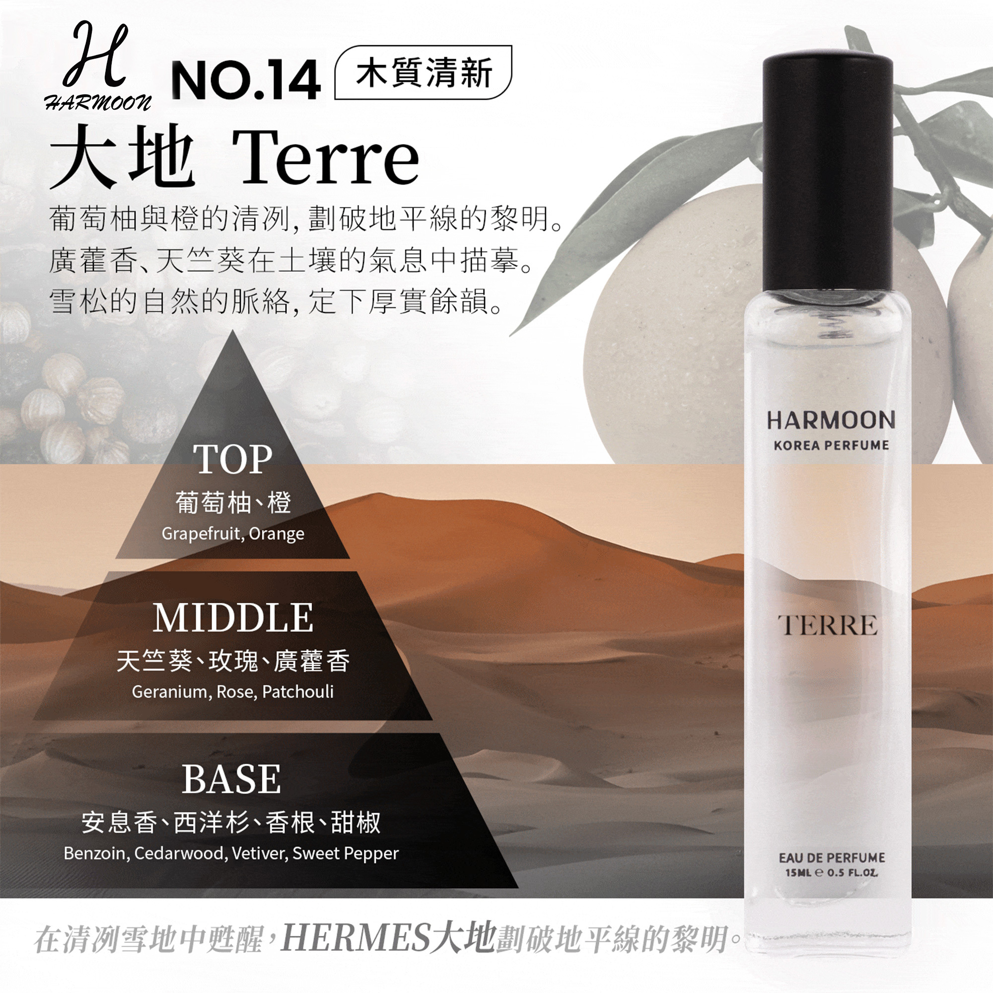 Terre 大地香氛前味由葡萄柚與橙構築出乾淨果香,像剛劃過空氣的晨光;中味是天竺葵、玫瑰與廣藿香堆疊出的綠意草本感,逐步收斂情緒;最後以安息香、西洋杉、香根與淡淡甜椒調描繪出泥土與木質的穩定餘韻。這是一款理性又感性的香氣,沒有侵略性,卻能讓人靜靜被吸引。適合內斂卻堅定的靈魂,與需要沉穩氣場的時刻。