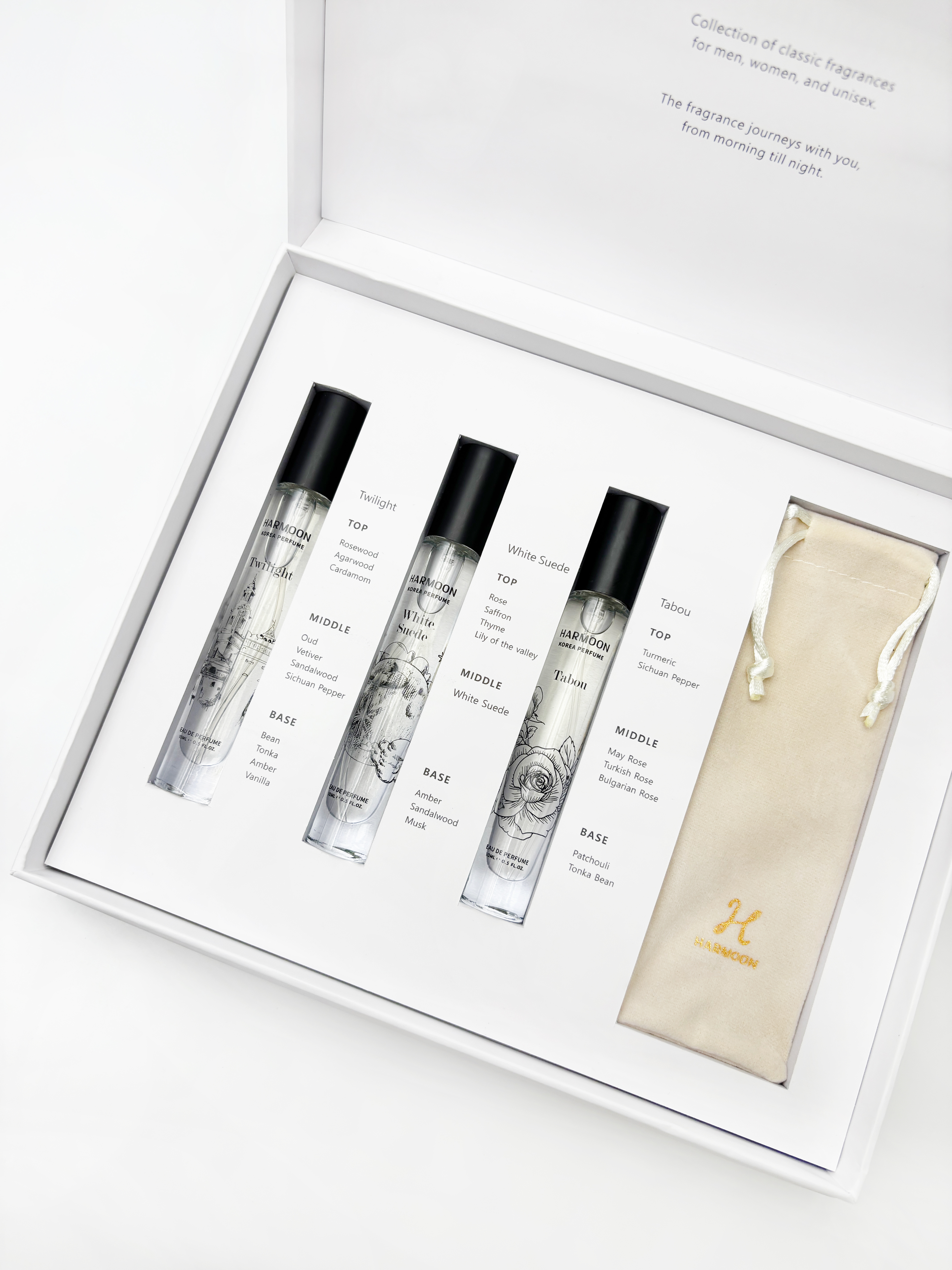 HARMOON 把這種類型的香氣,放進更實際的架構裡:不是買一大瓶暗黑香用不完,而是用香水禮盒的方式,讓你在需要時,打開抽屜就能挑一支「今晚要用的韓國香 氛」。